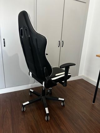 Silla de estilo gaming en color blanco y negro. Diseñada para ofrecer comodidad. - Respaldo alto. - Reposabrazos. - Base con ruedas.