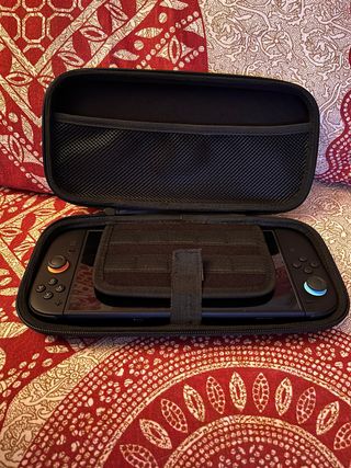 Funda protectora negra con asa para Nintendo Switch 2. Diseñada para mantener tu consola segura y organizada. - Interior acolchado. - Malla para accesorios. - Cierre de cremallera. - Funda para 10 tarjetas de memoria.