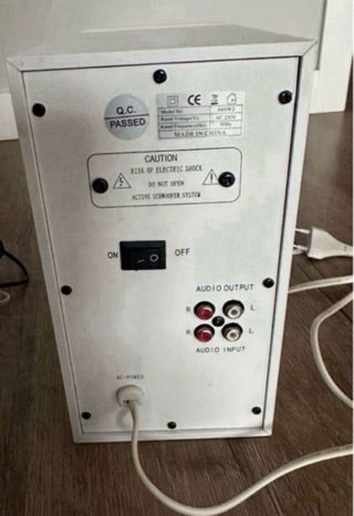 Sistema de altavoces con subwoofer. - Altavoces satélite de color blanco. - Subwoofer independiente.
