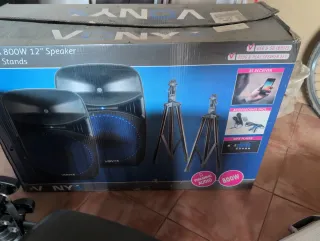 Set de altavoces Vonyx de 12 pulgadas con una potencia de 800W, prácticamente nuevos,ideal para eventos o uso profesional. Incluye soportes para altavoces,cables rca, cable RCA a aux, mando a distancia,micrófono y su caja original con sus embalajes. - Altavoces de 12 pulgadas. - Potencia de 800W. - Incluye soportes. - Entradas USB y SD. - Receptor Bluetooth. - Reproductor MP3. En el conjunto incluye mezclador de 3 canales behringer DX626, regalo maletín para transporte y guardar todos los cables. Altavoz, autoamplificado, mesa de mezclas, mezclador.