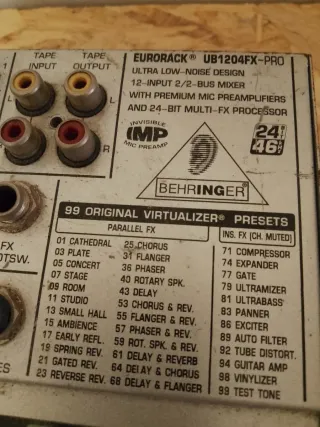 Mesa de mezclas Behringer en color gris y plateado. - Controles de EQ, PAN y AUX. - Faders de canal y master. Le falta: Un potenciómetro de canal Un selector de efectos Todas las teclas Pero funciona bien Para recambios o restaurar