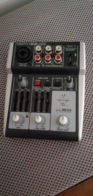 Mezclador de audio Behringer Xenyx 302USB en color negro y plateado. - Interfaz de audio USB. - Entrada de micrófono (XLR). - Entradas de línea estéreo (RCA). - Salidas principales (RCA). - Conexión para auriculares.