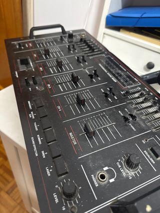 Mesa de mezclas DJ profesional en color negro y multicolor. Ideal para tus sesiones. 1990 - Múltiples canales de entrada. - Controles de nivel y ecualizador. - Salida para auriculares. La vendo funcionando. Lo ha dado todo y sigue dándolo.