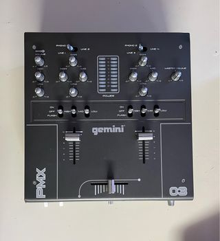 Mesa de mezclas Gemini PMX. Necesita limpiza en canal 1 funciona perfectamente. - Controles de volumen, ganancia y ecualización (altos, medios, bajos). - Indicador de nivel de potencia. - Crossfader y faders de canal.