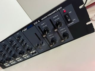 Mezclador preamplificador Swisonic ZM 4. Ideal para sonorizar locales de restauración, pubs, bares con distintas zonas de música. 4 entradas de micro/línea (con alimentación phantom de 15V) 4 salidas de zona línea Entrada auxiliar Paging telefónico Interruptor de prioridad Ecualizador de 2 bandas por canal El canal 1 tiene prioridad sobre los canales 2 - 5 Dimensiones: 483 x 134 x 195mm