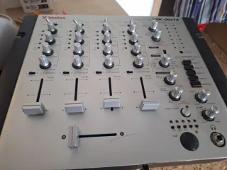 Mesa de mezclas Vestax VMC-004FX. - Diseño plateado y negro. - Controles de nivel y asignación. - Efectos integrados. Cuidada al máximo, siempre tapada, tiene sus años pero esta impoluta, y de sonido espectacular, con fx , funcionan todos los canales y de vez en cuando rasca uno , no he usado nunca ningún producto para arreglarlo. Negociable