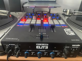 Mezclador profesional Reloop Elite en color negro. - Diseño compacto y robusto. - Controles intuitivos para DJ. - Conexiones versátiles. - Serato incluido + vinilos incluidos.