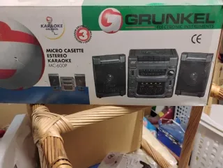 Equipo de sonido GRUNKEL modelo MC-600P. - Sistema de karaoke con micro casete. - Incluye dos altavoces. - Diseño compacto en color negro y gris.