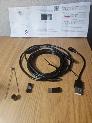 Cámara endoscópica con tubo flexible y varios accesorios. - Cable USB y micro USB. - Adaptador USB-C. - Herramientas de sujeción.