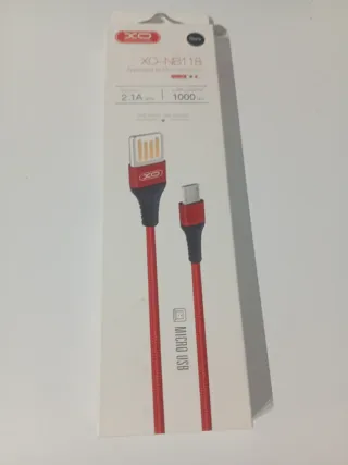 Cable de carga rápida XO NB118 para dispositivos Micro USB. Tiene un diseño trenzado y es de color rojo. - Salida de 2.1A. - Longitud de 1000 mm.