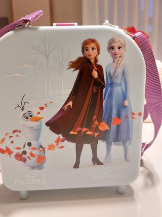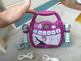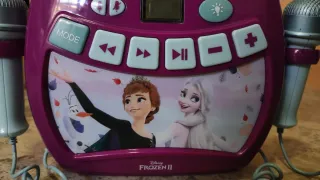Karaoke de Frozen II, marca Lexibook. Con dos micrófonos, bluetooth, USB, tarjeta SD, Line In y salida de auriculares. Con efectos de sonido y de luz. Funciona con batería, carga por USB -C (cable incluido de USB a USB-C y para Line In). En perfecto estado. 60€ nuevo