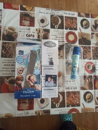 Reproductor de karaoke Frozen de Lexibook con 2 micrófonos, luces que parpadean al ritmo de la música, efecto de cambio de voz, función de grabación. Tecnologia Bluethooth y posibilidad de conectar auriculares, tarjeta microSD/TF o USB (no incluidos). Fue un regalo de Reyes, pero mi hija no lo usa. Está totalmente nuevo. Tengo incluso la caja, aunque está rota en la parte de arriba. Precio original 59,99€.