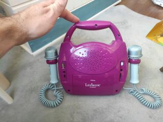 Reproductor de Cd’s cob karaoke incluido. lleva un microfono para poder cantar. Se puede acoplar el movil en el soporte que se ve en las fotos y poder cantar tus csnciones. Utilizado en muy pocas ocasiones, aunque no dispongo de caja. Lexibook. Salida de video. Salida de audio. Entrada auxiliar. Funciona con pilas o conectado a la red.