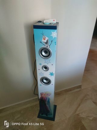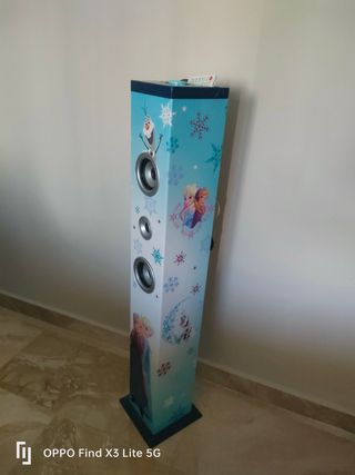 Torre altavoz con micrófono de Frozen, con conexión al móvil por cable y bluetooth. Funciona perfectamente. Los altavoces tienen metidos para dentro la parte blanda como se ve en la foto.