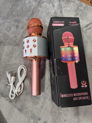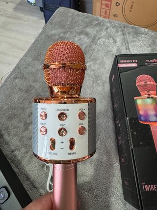 Micrófono de karaoke inalámbrico totalmente nuevo, con un diseño moderno y llamativo. Incluye un estuche para guardarlo y transportarlo fácilmente. - Micrófono con acabado brillante. - Diseño de rejilla en la parte superior. - Incluye manual de instrucciones. - Incluye cargador y clavija para ordenador o cualquier otro dispositivo compatible
