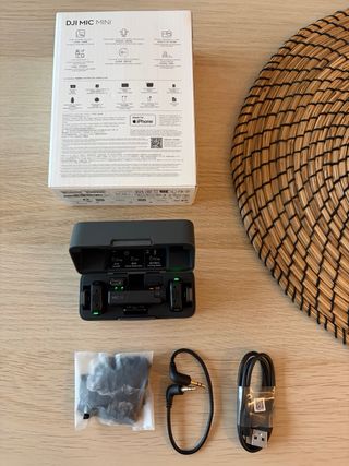Sistema de micrófonos inalámbricos DJI Mic Mini con transmisores y receptor. - Incluye 2 transmisores (TX). - Incluye 1 receptor (RX). - Estuche de carga para los componentes. Sin utilizar