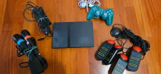 Consola PlayStation 2 en color negro, lista para horas de diversión. Incluye varios accesorios para complementar tu experiencia de juego. - Dos mandos originales Sony. - Múltiples micrófonos para juegos de canto. - Mando a distancia. - Cables de conexión y adaptadores. Regalo multitud de juegos hack, también disco hack.