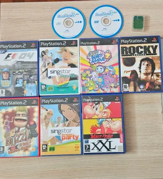 PlayStation 2 en buen estado, incluye dos juegos SingStar y dos micrófonos. También se incluyen dos mandos. Todo en perfecto estado de conservación. Incluye: - consola PlayStation 2. - Mando a distancia - Dos mandos para PlayStation 2. - Dos juegos SingStar: 'SingStar' y 'SingStar Pop Hits'. con dos micrófonos para SingStar. - juego “buzz” con 4 pulsadores - otros juegos: El señor de los anillos, RS3, super bust a move2, call of duty 2, mtx mototrax...