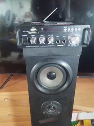 Torre de sonido con amplificador audio, 2 canales 300w+300w, en total 600w de salida, Blutooth, receptor de audio digital, Radio FM con antena, 2 puertos para microfonos, Puerto USB MP3, Ranura para MMC card, conexion para usarlo en el cche 12V, Conexion puerto RCA de audio, Mando a distacia SIN bateria, tiene peques detalles de esteticas, funcionamiento perfecto