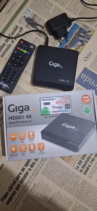 Box TV Reproductor multimedia Giga TV HD801 4K con sistema SmartTV Android 10. Incluye mando a distancia y cargador. Ya no es funcional puesto que se encuentra bloqueado y no puede arreglarse con un reseteo de fábrica. No deja meter cuenta Google. Si se conecta por WiFi pero no retiene la contraseña. Para piezas o alguien que sepa repararlo. - Resolución 4K. - Procesador Quad Core. - Android 10.0. - Compatible con HDR10. - Conectividad Wifi 2.4/5GHz. - Reproductor multimedia. Se envía en su caja original.