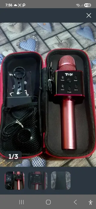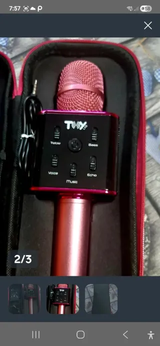 Micrófono portátil para karaoke con un diseño moderno y llamativo. - Acabado metálico en color rosa. - Controles integrados para voz, música y eco. - Incluye cable de conexión y accesorios. - Compacto y fácil de transportar en su funda.
