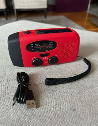 Radio Portátil con manivela dinamo, energía solar, linterna y bateria recargable USB. Ideal para emergencias. へ -Reproduce AM/FM. -LUZ LED. -Batería de 2000 mAh. -Carga USB para dispositivos móviles. -Diseño azul -Nueva, a estrenar -Sirva para cargar el movil Mas accesorios en mi perfil