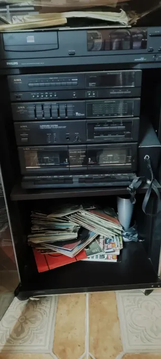 Sistema de sonido Aiwa en color negro. - Dos altavoces Aiwa. - Múltiples compartimentos para CDs y cassettes. - Diseño vertical. Se vende con cds y discos, pero no con los de vinilo. El reproductor de cds y el de cassettes no funciona Incluido con tocadiscos y 2 altavoces