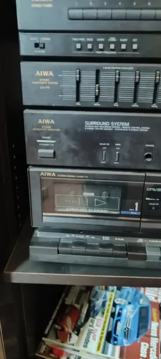 Minicadena de sonido Aiwa con múltiples funciones. Se vende sin altavoces. Solo la radio funciona bien. Para reparar o para componentes. - Reproductor de CD, con carrusel de 3 unidades - Sintonizador de radio FM y AM - Doble pletina de cassette. - Ecualizador gráfico. - Sistema Super T-Bass.