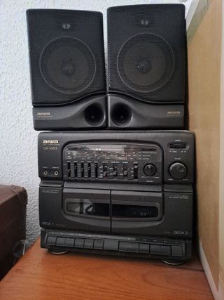 Minicadena de marca Aiwa, con dos altavoces de Aiwa ambos en perfectas condiciones. Tiene dos pletinas para cintas y bandeja para 3 CDs. Los CDs parece que los lee pero no acaba de reproducirlos, y respecto a las cintas imagino que funcionarán, pero no tengo ninguna para comprobarlo. Cuenta con radio FM que funciona y la función AUX también. No tiene ninguna señal de mal uso. El mando a distancia funciona perfectamente. Incluye el manual de instrucciones. Se hacen envíos o se entrega en mano en Burgos.