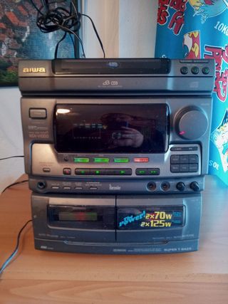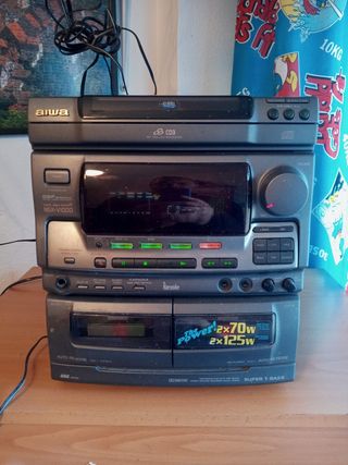 minicadena aiwa z-m2600, comprada como restaurada pero a veces salta el cd y el casette. el amplificador funciona a la perfeccion, con entrada de microfonos y mando a distancia, espacio para 5cd y ecualizador. incluye mueble con puertas y tapa de cristal para tocadiscos y ruedas. entrada y salida rca. como curiosidad, la rueda de volumen gira sola al subir o bajar el volumen con el mando