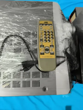 Minicadena marca JVC, en color gris y azul, tiene 2 altavoces sus cables y el mando a distancia como se puede comprobar en las fotos. Los CD y las casete no funciona solo funciona la radio, aunque se puede arreglar sin ningún problema.