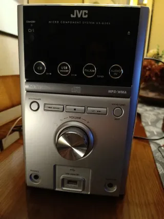 Minicadena JVC UX-G305 en color plata y negro. Permite reproducir música desde CD, USB y sintonizar radio FM/AM. - Reproductor de CD. - Puerto USB para reproducción de MP3/WMA. - Sintonizador de radio FM/AM. - Entrada auxiliar de audio. - Salida de auriculares.