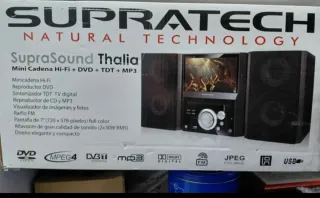 Minicadena Supratech Thalia en color negro. - Diseño compacto y moderno. - Incluye dos altavoces. - Panel frontal con controles y pantalla.