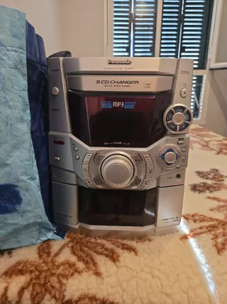 Equipo de música de marca Panasonic. Radio AM/FM, cargador de 5 CD's, doble pletina de cassette, subwoofer, 140w RMS.