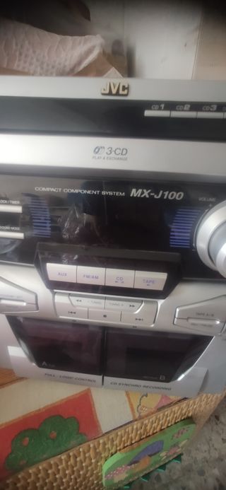 Minicadena/Equipo de Música marca JVC MX-J100 Bandeja para 3 Cds(No lee CD grabados, solo originales), entrada auxiliar RCA, Potencia de Sonido 45Wx2, Sintonizador Radio AM/FM, 2 pletinas-lectores de Cassette y mando a distancia. Altavoces en Perfecto Estado de Uso y Funcionamiento.