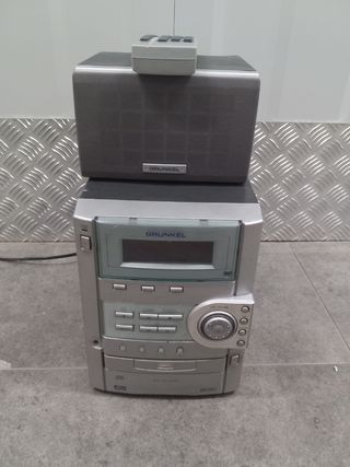 Minicadena Grunkel de muy buena calidad, tiene un sonido bastante bueno gracias a un subwofer pequeño de origen y 3 altavoces mas, ademas de mas entradas por si se le quieren añadir mas altavoces. Pongo para repaso porque lleva tiempo sin uso y he detectado los siguientes fallos: -Bandeja Cd/Dvd solo abre un poco, no abre entera -Panel frontal se queda bloqueado a veces en la opcion de CD. Con el mando si responde. Mando a distancia original con multiples funciones (bastante grande). Dispone de radio con sintonizador digital, CD con mp3 y Lector DVD para la tele, ademas de entrada auxiliar para conectarle equipo externo. Envio+10kg