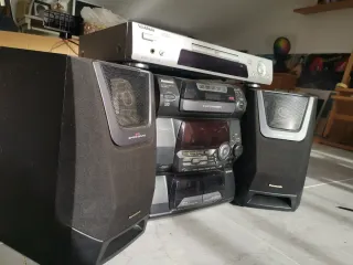 Minicadena Panasonic con un diseño moderno en plata y negro. - Sistema de 5 CD. - Doble pletina. - Sintonizador de radio. - Altavoces Super Woofer. He probado el CD y funciona, si bien los cambios entre distintos CDs parece que no van bien. Los casetes no los he probado.
