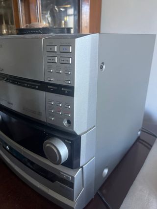 Minicadena de música con diseño moderno. - Altavoces de gran tamaño. - Múltiples compartimentos para componentes de audio. Cds no funciona el cambio de cds ,lleva cargador de 3 cds pero necesita una revisión o algo, lo demás funciona todo perfectamente