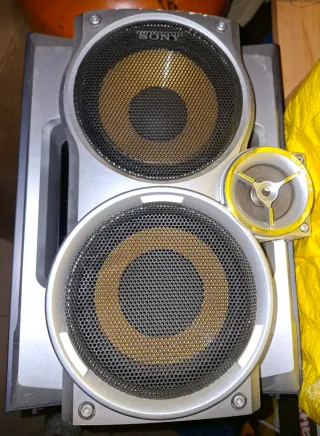 Vendo pareja de altavoces originales SONY pertenecientes al modelo RXD5. Son altavoces de gran calidad, muy potentes y con un sonido de graves (Groove) espectacular. Estado: Funcionan perfectamente. Estéticamente están muy bien, solo uno tiene un pequeño roce en una esquina (ver fotos) que no afecta para nada al sonido. Medidas de cada uno: 23 cm ancho x 34 cm alto x 28 cm fondo. Ideales para equipos vintage, amplificadores o como mejora de sonido. NOTA. Tengo también a la venta la minicadena sony que iba acompañada de estos altavoces, la radio funciona perfectamente pero CD's y cassete necesitarían reparación o para piezas