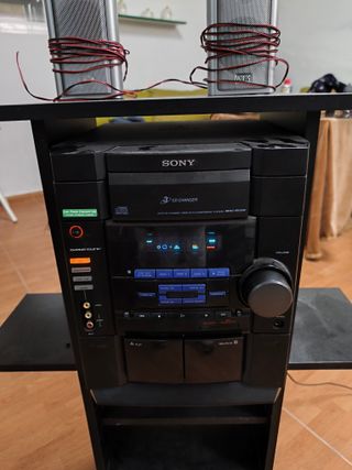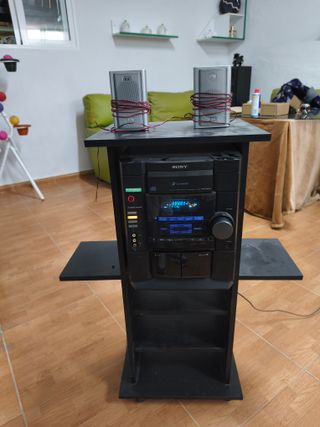 Minicadena Sony en color negro. Incluye varios componentes para tu entretenimiento. - Plato giradiscos. - Sintonizador de radio. - Doble pletina de casete. - Altavoces. Vendo con mueble incorporado