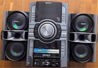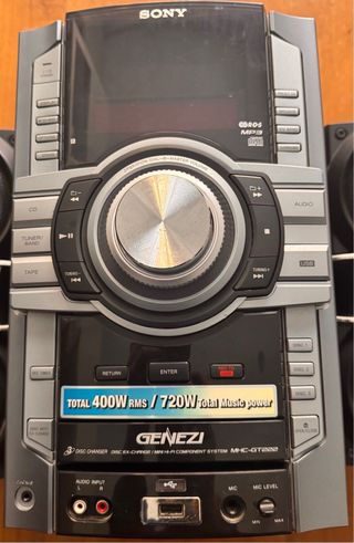 Minicadena Sony Genezi MHC-GT222 con altavoces. - Potencia total de 400W RMS (720W de potencia musical total). - Sistema de 3 CD Changer. (Funcionan bien). - Compatible con CD, CD-R/RW, MP3. (Funcionan bien). - Conexión USB. (Funcionan bien). - Entrada de audio. (Funcionan bien). - Entrada de micrófono. (Funcionan bien). Mando a distancia ( Funciona bien) Perilla manual de subir/bajar volumen no va muy bien; es muy sensible, puede que se sube/baja el volumen bruscamente (con el mando funciona perfectamente).