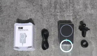 Cargador inalámbrico magnético para coche de 15W. - Compatible con carga de 10W, 7.5W y 5W. - Incluye cable USB. - Soporte para ventilación de coche.