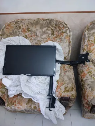 Monitor Samsung hdmi con brazo articulado para dos monitores, ideal para tu espacio de teletrabajo. El brazo se sujeta firmemente a mesas o escritorios. Modificado con soldadura para mesas mas anchas de lo normal - Monitor Samsung. - Brazo articulado con pinza. - Color negro -Soporte vesa
