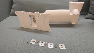 Soporte de pared para televisión en color blanco. Permite inclinar la pantalla para un mejor ángulo de visión. - Incluye tornillería y placas de montaje.
