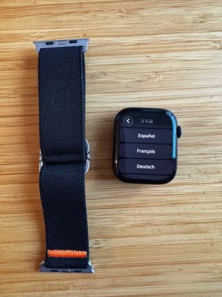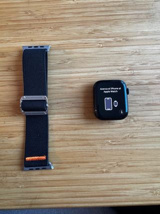 Reloj inteligente Apple Watch Series 8 celular de 45mm. Tiene pequeñas ralladas en la pantalla apreciables solo cuando esta apagada y a contra luz. En un costado tambien tiene una rallada. Todo se aprecia en las fotos. - Correa de tela negra con detalles naranjas. - Hebilla de ajuste de metal plateado. Apple , watch, smartwatch, reloj apple, reloj iphone, ultra, serie, se