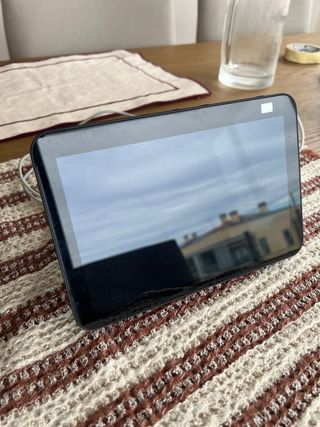 Pantalla inteligente Amazon Echo Show. - Diseño moderno y elegante. - Pantalla táctil a color. - Tiene pequeños toques en las esquinas.