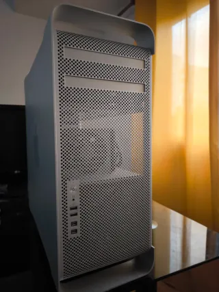 Ordenador de sobremesa Mac Pro modelo 5.1 del año 2010. Diseño icónico de Apple en acabado plateado. - Carcasa de aluminio perforado. - Asa superior integrada para facilitar el transporte. - Panel frontal con ranuras para unidades ópticas. - Puertos USB y audio en el frontal.