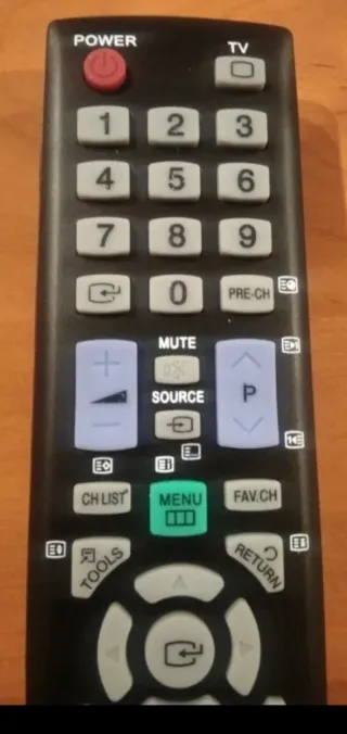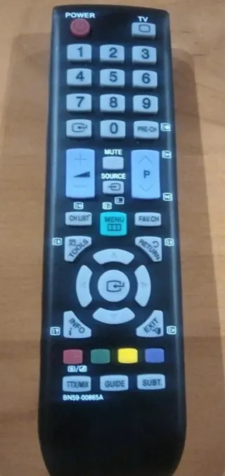 Mando a distancia para televisión Samsung. - Botones numéricos del 0 al 9. - Botones de función: POWER, TV, MUTE, SOURCE, MENU, FAV.CH, TOOLS, INFO, EXIT. - Botones de navegación y OK. - Botones de colores (rojo, verde, amarillo, azul). - Botones TTX/MIX, GUIDE, SUBT.