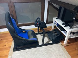 Soporte para volante de carreras y pedales. - Estructura metálica robusta. - Asiento tipo baquet con detalles en azul y negro con un pequeño desperfecto ya arreglado. - Base para pedales. - Compatible con volante Logitech G29. -Regulable en asiento para acercarse o alejarse de los pedales. [NO INCLUYE VOLANTE NI PEDALES]