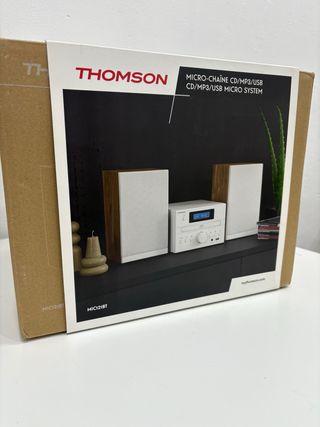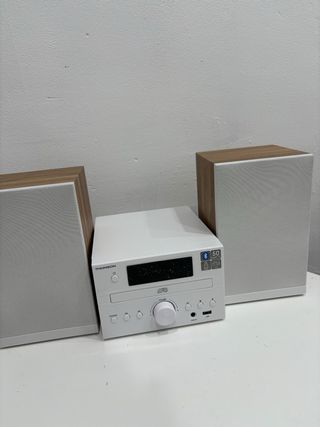 Mini cadena de música Thomson MIC121BT. - Diseño compacto y moderno. - Compatible con CD, MP3 y USB. - Acabado en blanco y madera.
